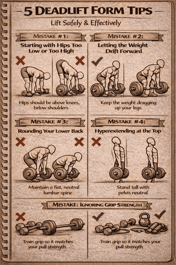 Mistake 1: Starting with hips too low or too high. Your hips should be above your knees but below your shoulders. Too low turns the deadlift into a squat. Too high shifts all the load to your lower back and hamstrings without engaging your quads or glutes properly. Film yourself from the side, freeze the frame right before the bar leaves the ground, and check your hip height. Adjust until your shins are nearly vertical and your torso angle matches your limb lengths.